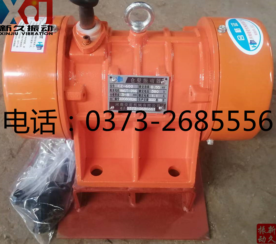 備注:CZ-600型系CZ系列倉壁振動器,激振力:0-6kN,轉速:3000r/min,功率:0.55kW,電壓:380v,電流:1.1A,是料倉、料罐、料斗、溜槽及輸送管道等設備的理想防閉塞裝置。